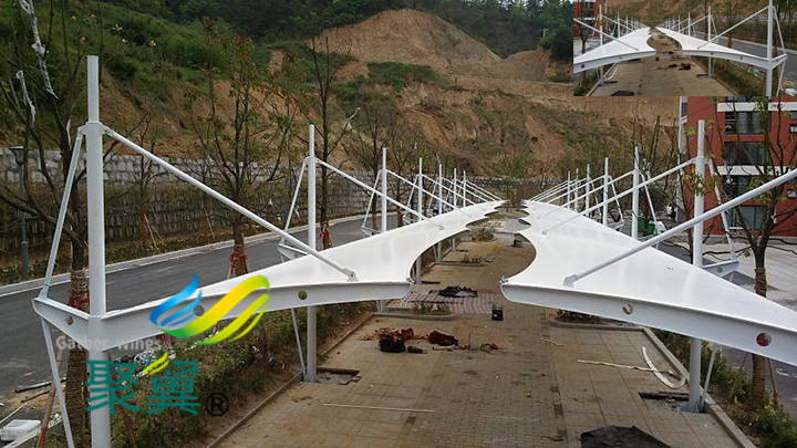 膜結構車棚汽車停車棚耐候性:表面有防紫外線共擠層,可防止太陽紫外線引起的材料變黃,表面共擠層具有化學縐吸收紫外線并轉化為可見光。
