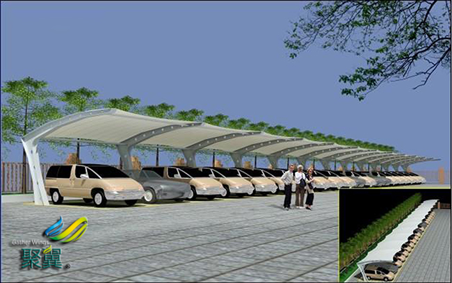 膜結構車棚膜材強度,包括抗拉強度與撕裂強度。視膜結構的面積、預應力等來選擇技術參數合適的膜材,使膜結構材料即能滿足膜結構建筑需要,又不會造成浪費。