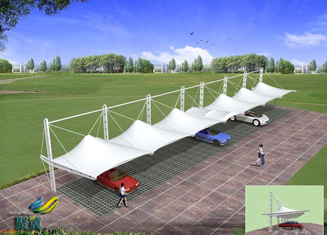 膜結(jié)構(gòu)車棚也稱為織物結(jié)構(gòu)車棚,是20世紀(jì)中葉發(fā)展起來(lái)的一種新型大跨度空間結(jié)構(gòu)形式。它以性能優(yōu)良的柔軟織物為材料,由膜內(nèi)空氣壓力支承膜面,或利用柔性鋼索或剛性支承結(jié)構(gòu)使膜產(chǎn)生一定的預(yù)張力,從而形成具有一定剛度、能夠覆蓋大空間的結(jié)構(gòu)體系。