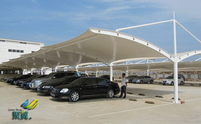 聲學性能:膜結構車棚的單層膜隔音僅有10dB左右,因此,單層膜結構建筑往往用于對隔音要求不是太高的活動場所。膜體加裝吸音棉或內襯采用聲學結構設計后,可大大提高其隔音性能。