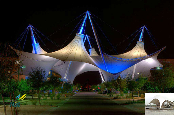 1、造型優(yōu)美。膜結(jié)構(gòu)車棚采用質(zhì)軟已于造型的膜材料為主材,可設(shè)計成多種造型。
