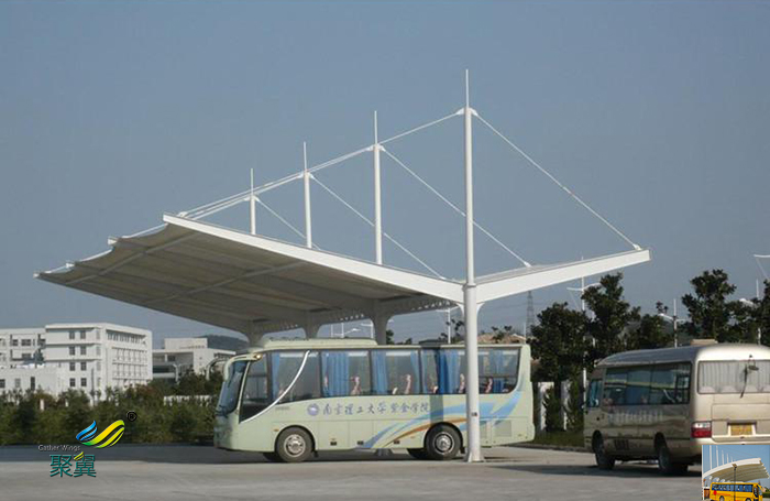 大巴車停車棚結構方式:是由多種高強薄膜資料(PVC或Teflon)及加強構件 (鋼架、鋼柱或鋼索)經過必定方式使其內部發生必定的預張應力以構成某種空間形狀,作為掩蓋結構,并能接受必定的外荷載效果的一種空間結構方式。