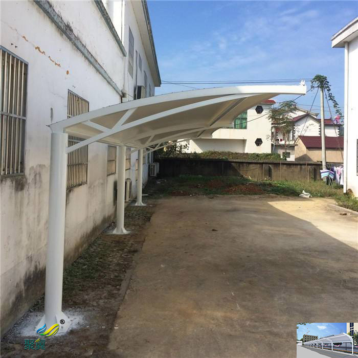 膜結(jié)構(gòu)車棚膜結(jié)構(gòu)所用的膜材料為具有高強(qiáng)、阻燃、耐久、自潔等特性的高強(qiáng)復(fù)合材料,一般由基布和涂層二部分組成.基布主要采用高強(qiáng)聚脂纖維或玻璃纖維絲編織而成,有平織和絞等多種編織方法,不同的膜結(jié)構(gòu)車蓬編織方法影響著膜材料的經(jīng)緯向力學(xué)性能指標(biāo),提供膜的抗拉強(qiáng)度和抗撕裂強(qiáng)度等;涂層材料主要有聚四氟乙烯和聚氯乙烯,在一定程度上提高了膜材料各項(xiàng)強(qiáng)度指標(biāo),為提高膜材料的耐久、自潔等特性,表面往往有一層氟涂層或硅涂層,提供膜材料的耐火、耐久及防水、自潔等性能,決定著膜材料的物理特性.